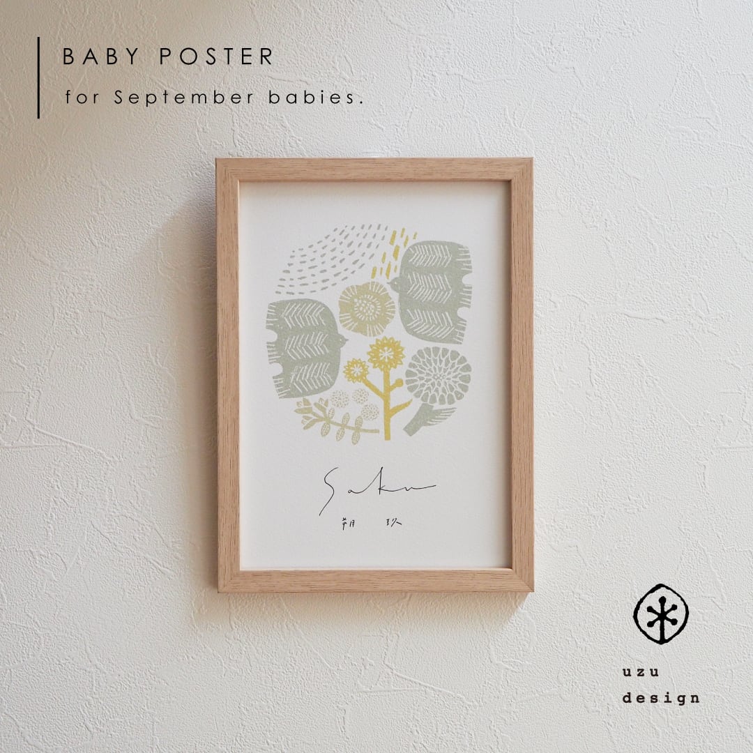 9月に咲く草花や太陽、健康・幸せを願う鳥のモチーフなどを組み合わせ、すくすくと健やかに育ってほしい想いを込めました。